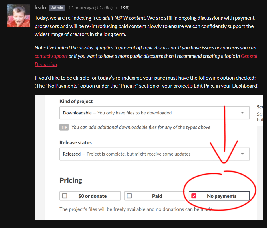Itch.io seems to have been able to negotiate a deal where they can keep NSFW games on this site, so long as the option to tip us here is completely removed.