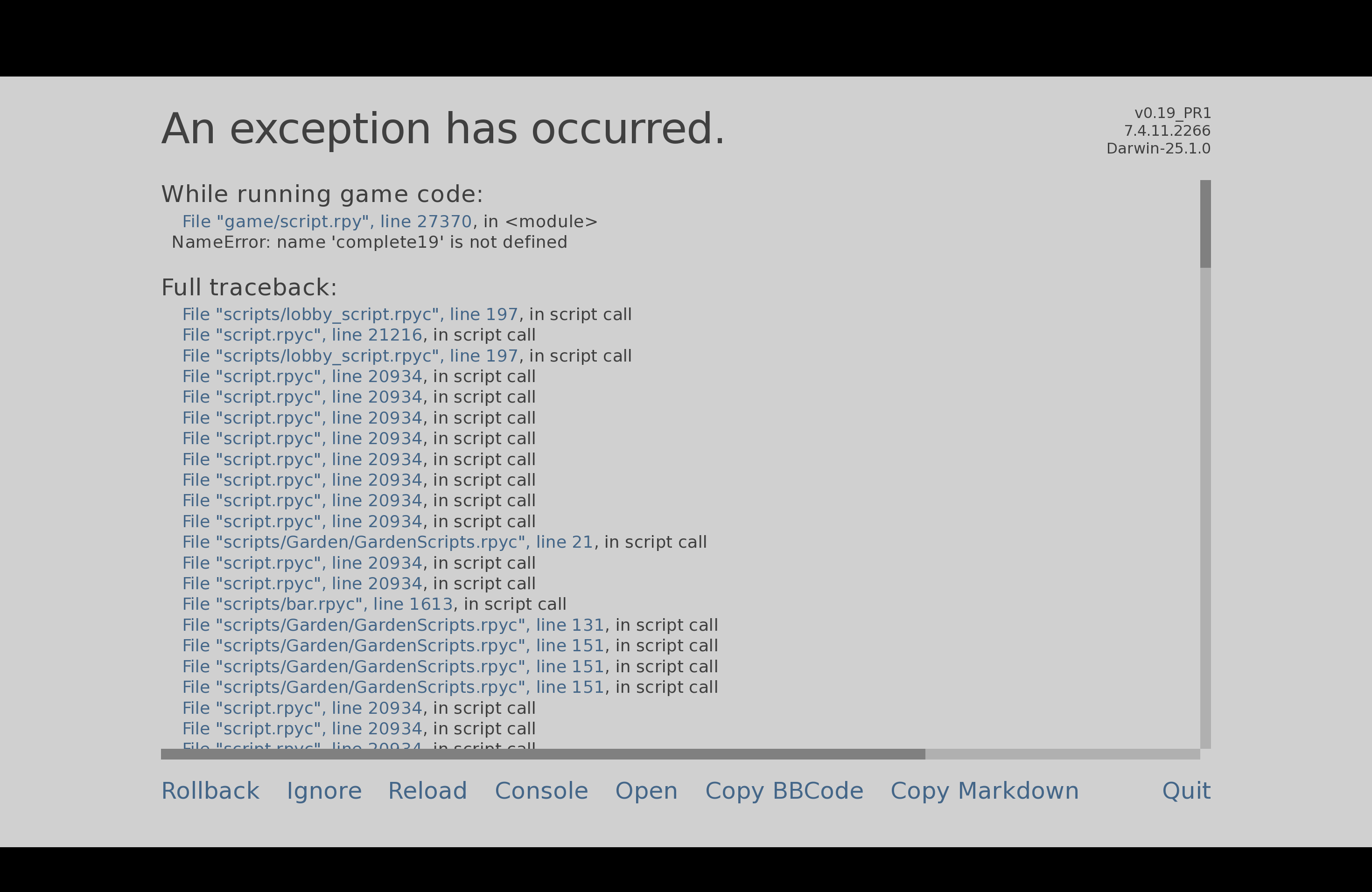 How to fix a problem with an error in which it says File "game/script.rpy", line 27370, in <module> Name error: name 'complete19' is not defined? I'm playing on macOS, and I've finished Lin's story for version 19.1. I consistently receive this message after every action, which annoys me. Pressing the ignore function or reloading doesn't help for me.