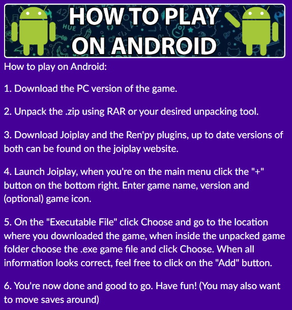 If installing still fails, check out Youtube videos on how to install renpy game on Android with Joiplay.